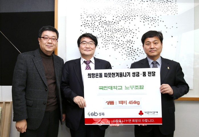 [시민일보]서울 성북구 국민대학교 노동조합이 최근 성북구청을 방문해 '희망온돌 따뜻한 겨울나기' 사업에 써달라며 백미 454㎏을 기증했다. 사진은 김영배 성북구청장(오른쪽), 국민대학교 법과대학 이광택 교수(가운데), 국민대학교 노동조합 위원장 윤정국(왼쪽)이 기념촬영을 하는 모습.
