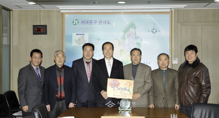[시민일보]서울 문석진 서대문구청장은 지난 23일 신촌상권 활성화의 초석을 다지고 깨끗한 도시 이미지를 확보하기 위해 시행한 '연세로 간판개선 사업'의 공로를 인정받아 '연세로 간판개선 주민위원회'에게 쌀 500kg의 성품과, 감사패를 수여받았다. 사진은 문석진 서대문구청장(가운데)과 '연세로 간판개선 주민위원회' 관계자들이 기념촬영을 하는 모습.
