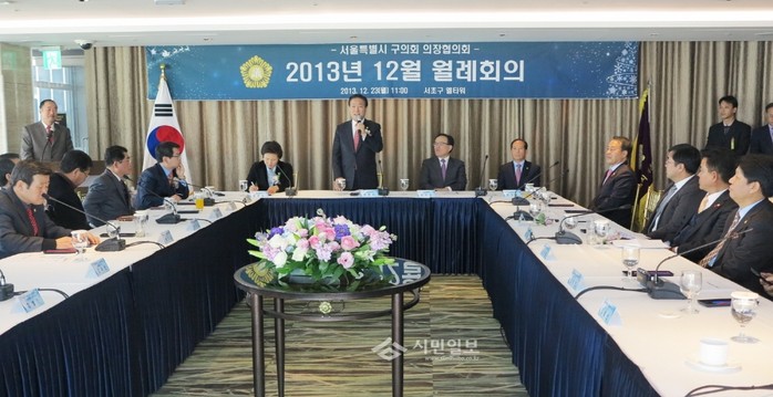 [시민일보]서울시 구의회의장협회(협희장 박영모)는 지난 23일 서초구 엘타워에서 '서울특별시구의회의장협의회 12월 월례회의'를 개최하고, 구의원 선거교육 세미나 개최 및 2013년 하반기 운영비 결산감사 계획에 대한 공지와 2014년도 주요사업과 예산안에 대한 심의를 실시했다.