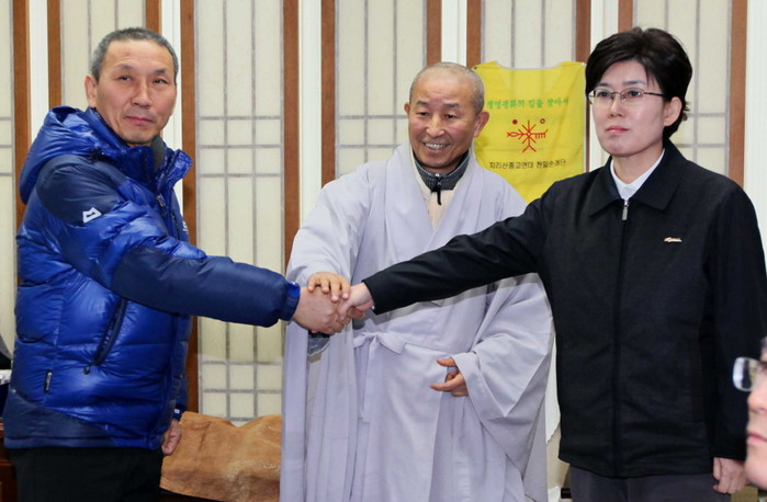 | ▲ 최연혜 코레일 사장(오른쪽)과 박태만 철도노조 수석부위원장(왼쪽)이 26일 서울 견지동 한국불교역사문화기념관에서 조계종 화쟁위원회 도법 스님(가운데) 중재로 만나 악수하고 있다. /뉴시스 | ||