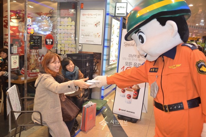 [시민일보]서울 강남소방서는 최근 시민들의 안전문화 확산을 위해 강남구 삼성역과 강남역 지하상가 주변에서 강남소방서 및 강남의용소방대, 강남역·삼성역 관계자 등 150여명이 모여 '생명의 문 비상구' 안전점검과 캠페인을 실시했다. 사진은 119 공식 캐릭터 화동이가 캠페인 도중 홍보 물품을 나눠주는 모습.