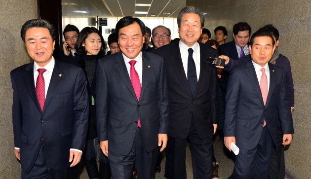새누리당 김무성 의원과 김태흠 의원, 민주당 박기춘 사무총장과 이윤석 국토위 간사가 30일 오전 서울 여의도 국회의사당에서 국토교통위 산하 철도산업발전 등 현안을 다룰 소위를 구성에 합의했다고 발표하기 위해 이동하고 있다.