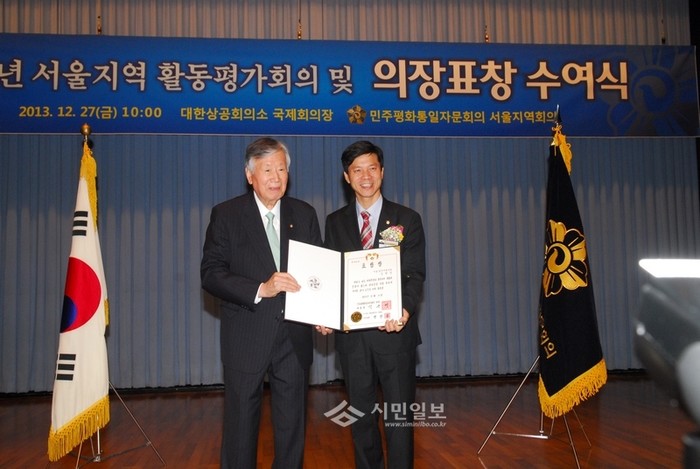 시상식은 지난 27일 대한상공회의소 국제회의장에서 개최한 민주평화통일자문회의 '2013년 서울지역활동평가회의 및 의장표창 수여식'에서 진행됐다.