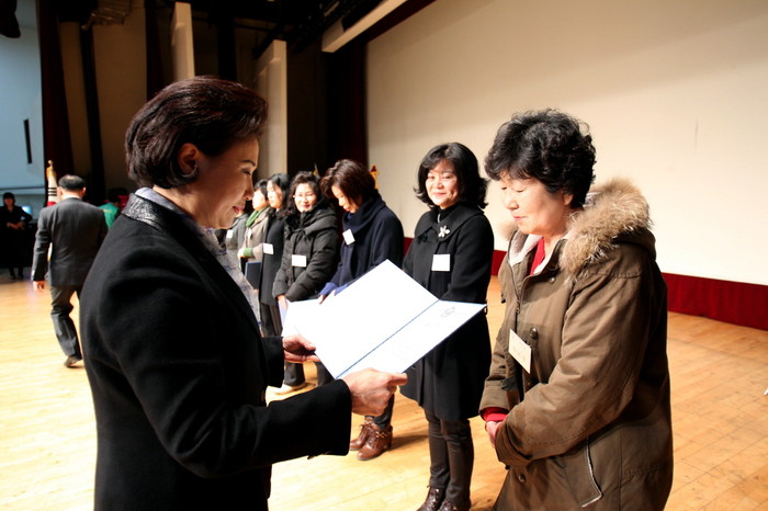 지난 12월30일 서울 강동구민회관에서 새마을운동 강동구지회가 ‘2013 연말자체평가대회’를 열고 한 해 동안 뛰어난 활동을 한 지도자들에게 표창장을 수여했다. 사진은 평가대회에서 표창장을 수여하고 있는 강동구의회 김정숙 의장과 수상자들의 모습.
