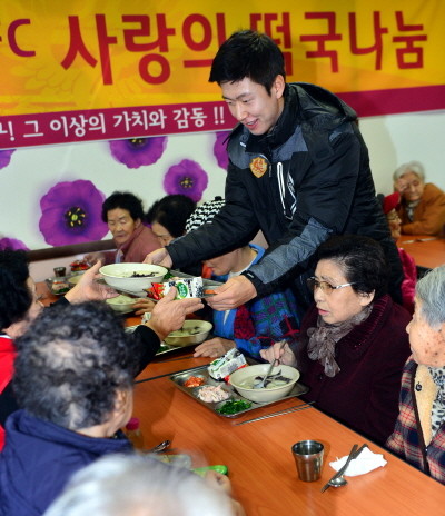 2일 오전 광주 서구 금호동 금호종합사회복지관에서 프로축구 광주FC 감독과 선수단이 2014년 첫 훈련에 앞서 '사랑의 떡국 나눔' 배식 봉사를 하고 있다.
