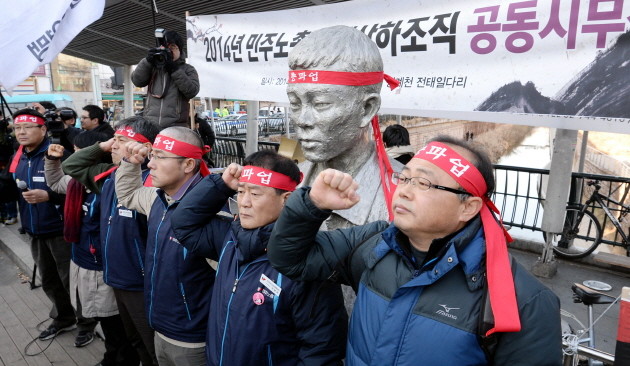 민주노총이 2일 오전 서울 종로구 종로5가 청계천 전태일다리에서 2014년 민주노총 가맹산하조직 공동시무식을 열고 있다.