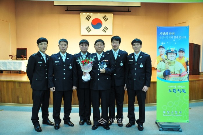 [시민일보]경기 성남 분당소방서는 최근 평소 각종 재난현장에서 시민들의 생명과 재산 보호에 앞장섰으며 상호 간 소통, 화합을 통해 동료애를 실천한 송성균 119구조대장(52)을 '2013년도 분당소방서를 빛낸 으뜸 직원'으로 선정·표창했다. 사진은 상을 받은 송성균 구조대장(오른쪽 세번째)이 동료들과 함께 기념촬영을 하는 모습.
