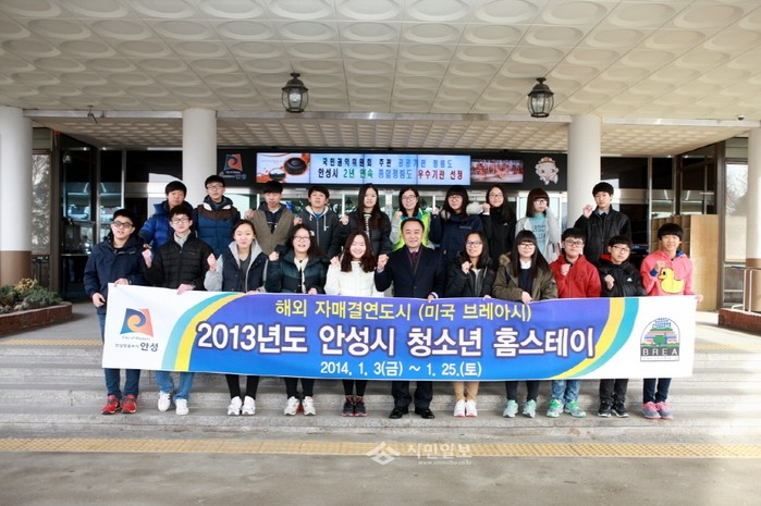 [시민일보]경기 안성시는 오는 25일까지 자매결연을 맺고 있는 미국 캘리포니아주 브레아(Brea)시와의 문화교류의 일환으로 현지가정에서 홈스테이를 하며 어학연수 및 문화체험 등을 실시한다. 사진은 지난 3일 황은성 안성시장과 학생들이 출발 전 기념촬영을 하는 모습.