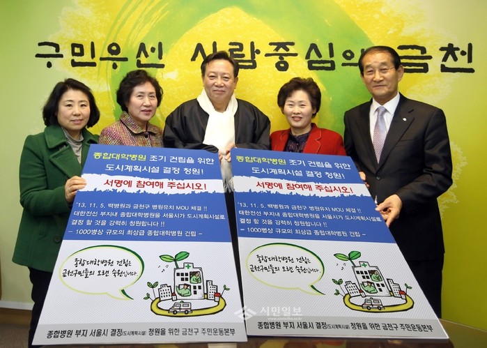 [시민일보]서울 금천구 주민운동본부는 지난 6일 금천구청 구청장실에서 옛 대한전선부지 내 종합병원을 서울시가 도시계획시설로 결정해 줄 것을 청원하는 서명운동에 적극 참여할 것에 동의했다. 간담회 후 차성수 구청장 및 공동대표들이 서명운동 피켓을 내보이고 있다.