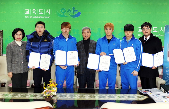 경기 오산시는 지난 7일 오후 집무실에서 2014년 직장운동경기부 오산시청 수영팀에 대한 위촉장 수여식을 했다. 왼쪽부터 서현숙 경제문화국장, 유규상 선수, 홍승리 선수, 곽상욱 오산시장, 정원용 선수, 주장훈 선수, 김진현 감독의 모습.