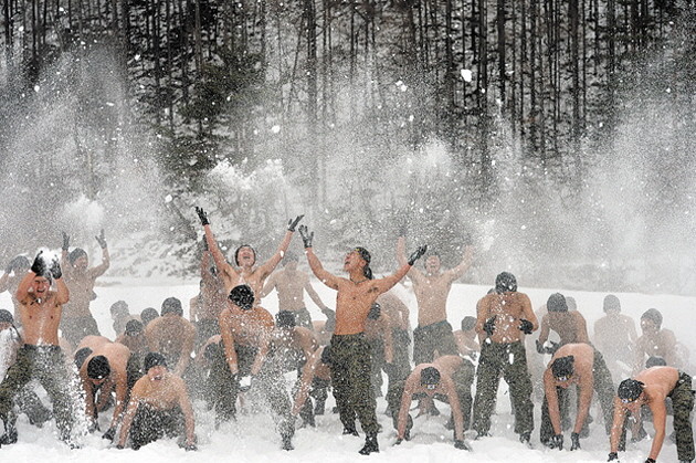 8일 오전 강원도 평창군 대관령면 차항리 황병산 훈련장에서 열린 '특전사 설한지 극복 훈련'에서 1공수 특전 여단 장병들이 눈을 맞으며 추위를 극복하고 있다.