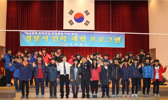 | ▲ 김포경찰서가 마련한 견학, 체험 프로그램 참가자들이 기념촬영을 하고 있다. | ||