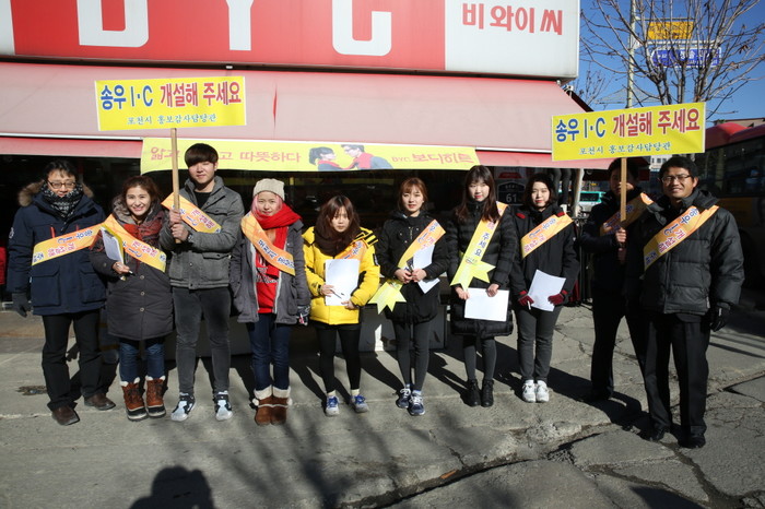 경기 포천시는 지난 9일 포천시 대학생 홍보사절단과 함께 '구리~포천 민자고속도로' 유치를 위해 '구리~포천 민자고속도로 송우 IC 개설 및 가산 IC 설계변경' 서명운동과 관련 내용의 홍보활동을 실시했다. 사진은 홍보에 나선 포천시 대학생 홍보사절단원들의 모습.