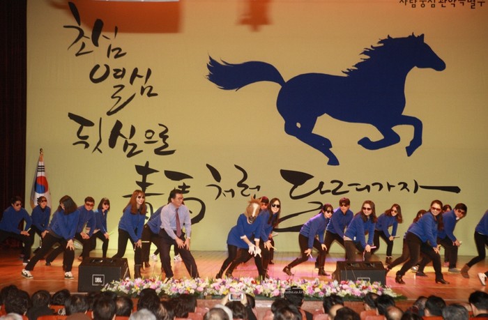 [시민일보]관악구가 지난 9일 관악문화관 도서관 공연장에서 주민 1000여명이 참석한 가운데 ‘2014년 신년인사회’를 개최했다. 이날 인사회에는 유종필 구청장과 직원들이 주민들을 위해 마련한 특별 이벤트가 열렸다. 사진은 유종필 구청장이 신년회에서 직원들과 함께 말춤을 추고 있는 모습.