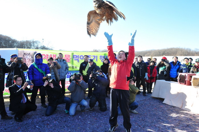 경기 양주시는 지난 13일 효촌저수지 제방 앞에서 ‘겨울철 야생동물 먹이주기 행사’를 실시해 7톤 분량의 먹이를 살포하고, 굶주림과 부상으로 구조된 조류 중 방사훈련을 마친 멸종위기종 20여수를 방사했다. 사진은 현삼식 양주시장이 독수리를 방사하는 모습.