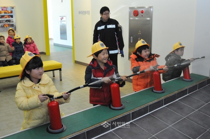 [시민일보]서울 은평소방서에서는 지난 14일 시민안전체험교실에서 선덕유치원생과 지도교사를 대상으로 지진체험, 소화기 화재진압체험, 열·연기 피난체험 등 화재예방 소방안전교육을 실시했다. 사진은 원생들이 소화기 화재진압체험을 하고 있는 모습.