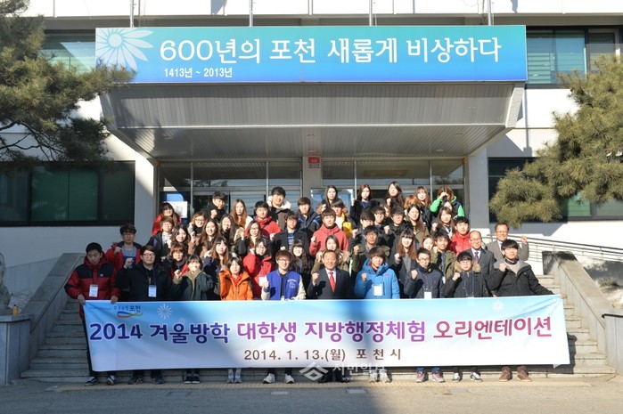 [시민일보]경기 포천시는 지난 13일 시정회의실에서 ‘2014 겨울방학 대학생 지방행정체험’ 오리엔테이션을 개최했다. 사진은 대학생들과 서장원 시장(앞줄 가운데)이 대학생 오리엔테이션이 끝나고 기념촬영을 하는 모습.