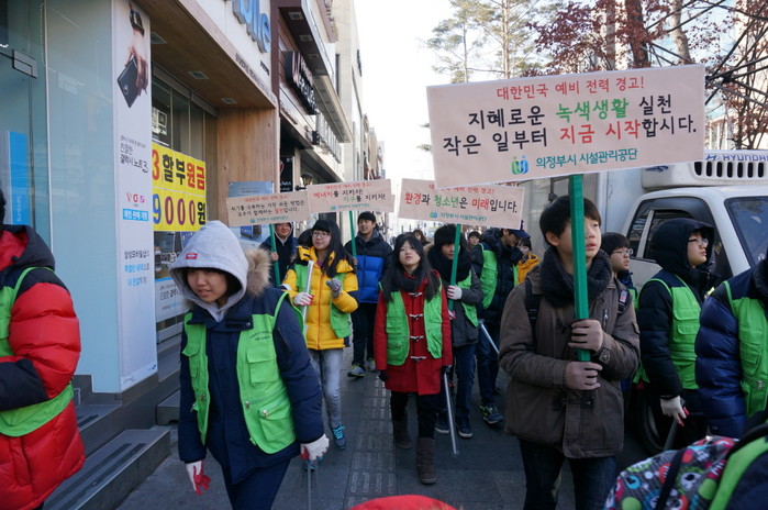 [시민일보]경기 의정부시시설관리공단은 지난 15일 1318(청소년) 자원봉사자들과 직원들이 저탄소 의정부역 주변, 둔치주차장에서 쓰레기 650ℓ를 수거하고, 의정부역에서 시장 앞까지 에너지 절약 거리 캠페인 및 홍보활동을 진행했다. 사진은 거리 캠페인을 진행하는 모습.
