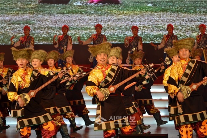 | ▲ 중국 감숙성 장족가무단이 전통의상을 입고 공연을 선보이고 있다. | ||