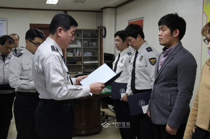 [시민일보]인천부평경찰서는 지난 17일 4/4분기에 편의점 강도를 검거하는 등 맡은 업무에서 업무 유공자로 선정된 경찰관 5명에게 표창장을 수여하고 격려하는 표창수여식을 열었다. 사진은 표창수여식에 참여한 조종림 부평경찰서장과 수상자들의 모습.