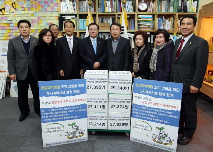 지난 17일 서울 금천구 '주민운동본부'는 종합대학병원의 조기건립을 위해 주민대표들이 25만여명의 서명을 받아 김병하 서울 행정2부시장에게 '종합대학병원 조기 건립 청원' 서명부를 전달했다. 사진은 서명부를 전달하는 '주민운동본부'의 모습.
