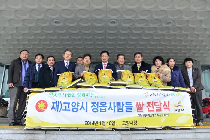 [시민일보]지난 16일 ‘고양시 정읍사람들’ 회원들은 ‘고양시민 복지나눔 1촌 맺기’를 통해 회원들의 기부금으로 구매한 쌀 1000kg을 경기 고양시에 기부했다. 고양시는 기부된 쌀을 다문화가정센터와 북한이탈주민 2개 기관에 전달했다. 사진은 기탁식에 참여한 최성 고양시장과 ‘고양시 정읍사람들’ 회원들의 모습.