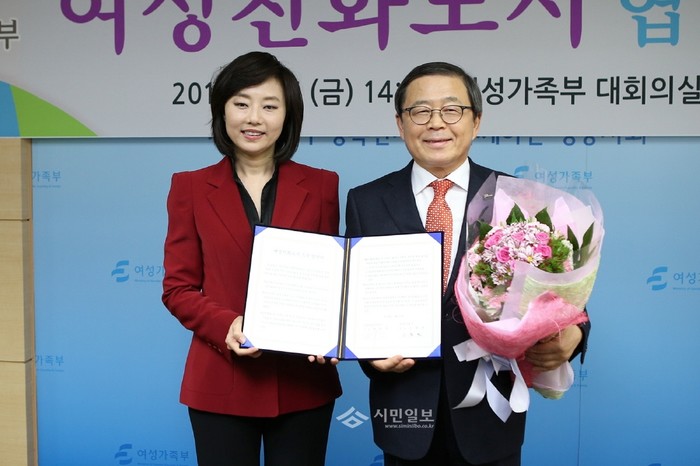 [시민일보]17일 경북 구미시는 여성가족부 대회의실에서 향후 5년간 여성친화도시 조성으로 양성평등과 주민의 삶의 질 향상을 위해 상호 협력한다는 내용의 ‘여성친화도시 조성 협약식’을 열었다. 사진은 상호 협력 다짐 협약서를 들고 있는 남유진 구미시장(오른쪽)과 조윤선 여성가족부 장관(왼쪽)의 모습.