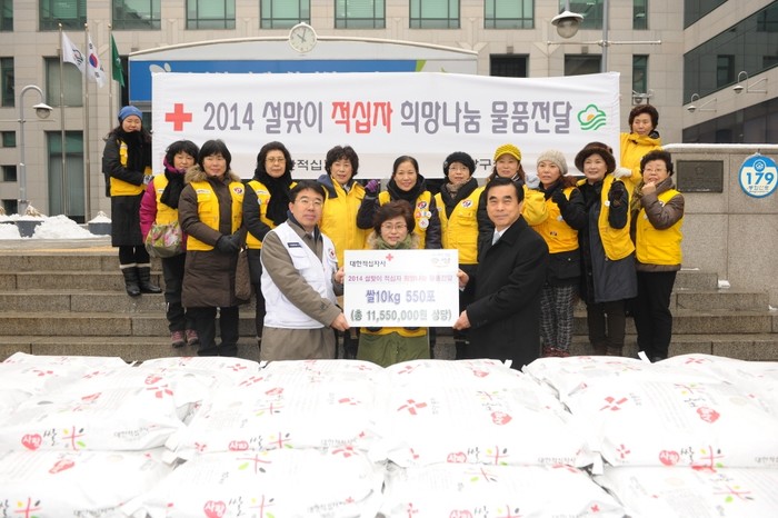 [시민일보]20일 대한적십자사 중랑노원 희망나눔 봉사센터가 중랑구에 지역내 어려운 이웃들에게 전달해달라며 쌀 5500kg(1100만원 상당)을 기탁했다. 사진은 기탁식에 참여한 문병권 중랑구청장(앞줄 오른쪽)과 적십자사 회원들의 모습.