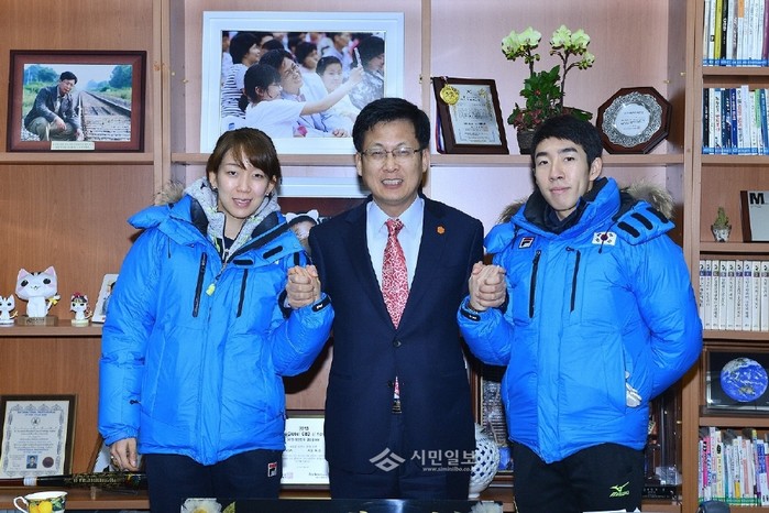 [시민일보]지난 20일 최성 경기 고양시장은 2014 소치 동계올림픽 쇼트트랙 경기에 출전하는 고양시청 직장운동경기부 소속 이호석, 조해리 선수를 격려했다. 사진은 최성 시장(가운데)과 조해리 선수(왼쪽), 이호석 선수(오른쪽)의 모습.