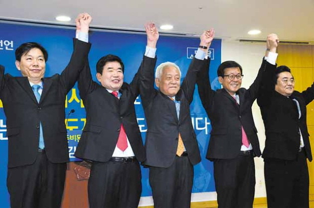 21일 오전 서울 여의도 국회 의원회관 제2소회의실에서 열린 김진표 의원 경기도지사 출마선언식에 참석한 김한길 대표와 전병헌 원내대표가 경기도지사 출마후보자들과 손을 잡고 참석자들에게 인사를 하고 있다. 왼쪽부터 김창호 후보자 , 김진표 후보자, 김한길 대표, 원혜영 후보자, 전병헌 원내대표.