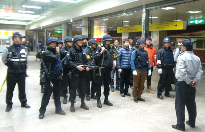 | ▲ 부평서가 부평역 대합실에서 대테러 모의훈련을 하고 있다. | ||