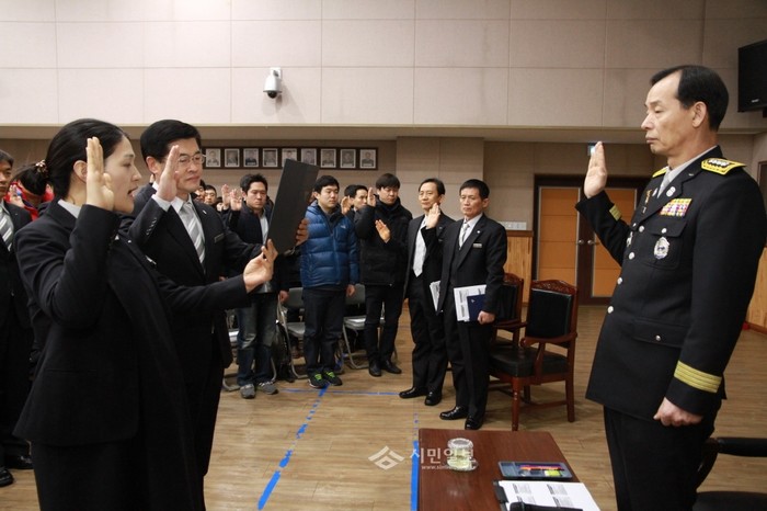 [시민일보]22일 서울 구로소방서는 투명ㆍ청렴한 공직생활 실천을 위해 ‘2014년도 상반기 소방청렴도 향상을 위한 자정결의대회’를 개최하여 전직원이 참여토록 했다. 사진은 자정결의대회에서 유건철 구로소방서장(오른쪽)과 직원이 선서식을 거행하고 있는 모습.
