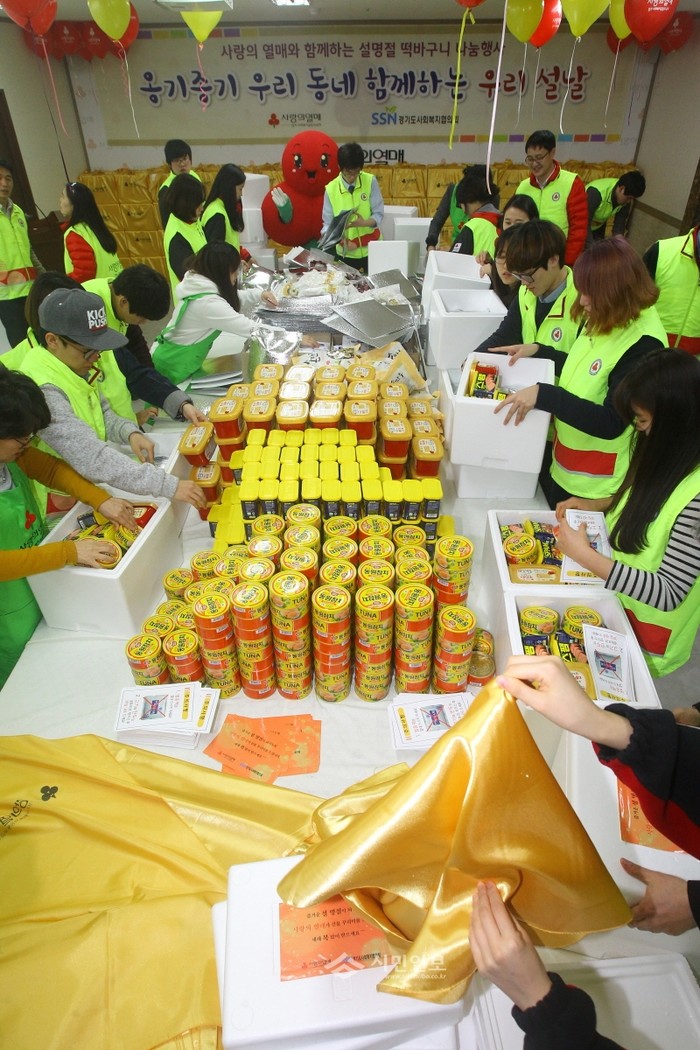 설명절을 일주일여 앞둔 23일 오후 경기 수원 경기사회복지공동모금회에서 열린 ‘옹기종기 우리 동네, 함께하는 우리 설날’ 에서 사랑의열매 봉사단과 임직원들이 어려운 이웃에게 전달할 설맞이 음식 및 제수용품 선물 꾸러미를 포장하고 있다.