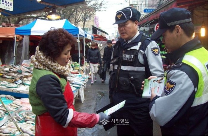 [시민일보]인천 계양경찰서는 24일 설 명절을 앞두고 예상되는 각종 범죄를 예방하기 위해 병방시장일대 시장상인 대상으로 상인 및 방문객들에게 최근 발생하고 있는 범죄사례를 설명하는 설 명절 특별 범죄예방 홍보 활동을 실시했다. 사진은 인천 계양서 직원들이 범죄예방 홍보활동을 전개하고 있는 모습.