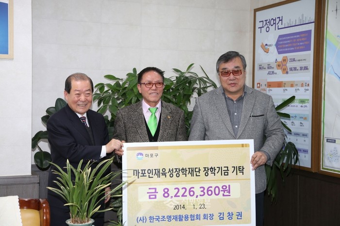 [시민일보]지난 23일 서울 마포구 ‘마포인재육성장학재단’에 (사)한국조명재활용협회가 폐형광등 재활용 처리 수익금의 일부인 822만6360원을 전달했다. 사진은 박홍섭 마포구청장(왼쪽), 권오범 마포인재육성장학재단 이사장(가운데), 김창권 (사)한국조명재활용협회 회장이 기념촬영을 하는 모습.