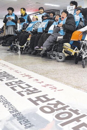 27일 오후 서울 서초구 반포동 서울고속버스터미널 경부선 대합실에서 전국장애인철폐연대 주최로 열린 ‘고속버스 및 시외버스 장애인 접근권 보장을 위한 기자회견’에서 참가자들이 구호를 외치고 있다.