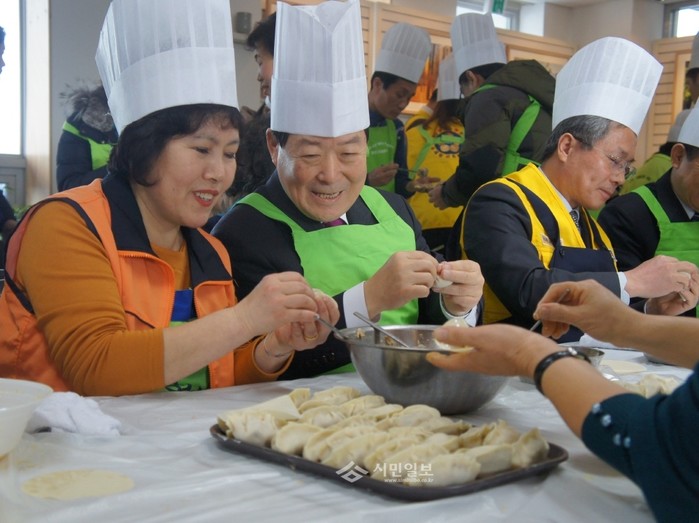 [시민일보]설 명절을 맞아 28일 서울 마포구 상암동주민센터에서 새터민과 마포지역 자원봉사자, 마포세무서 직원들이 참석한 가운데 ‘설맞이 새터민 어울림 한마당’이 개최됐다. 사진은 만두를 빚고 있는 정선화 자원봉사자(왼쪽), 박홍섭 마포구청장(가운데), 박수영 마포세무서장(오른쪽)의 모습.