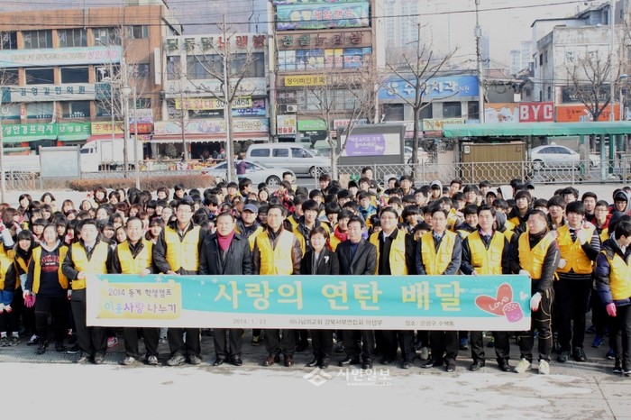 [시민일보]지난 23일 서울 은평구 수색동에서 하나님의교회 강북서부연합회 청소년 300명이 저소득 연탄사용 가구에 3000여장의 연탄기증 및 배달 봉사를 했다. 사진은 어려운 이웃돕기 봉사에 참여한 학생들과 관계자의 모습.