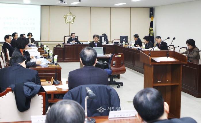 [시민일보]지난 22일 서울 송파구 롯데월드타워 건립 관련 행정사무조사 특별위원회는 롯데월드타워 건립관련 환경ㆍ교통 개선사업 추진 등의 부분을 시정하기 위해 롯데 관계자들과 회의를 했다. 사진은 관계자들이 송파구의회에서 질의ㆍ응답을 하고 있는 모습.