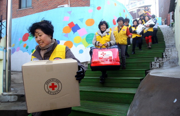 설날을 사흘 앞둔 28일 오전 경기 수원 지동 벽화마을에서 설맞이 집중구호에 나선 경기 적십자 봉사원들이 구호품을 안고 소외된 이웃들에게 향하고 있다. 경기적십자사는 지난 20일부터 열흘간 1억9000여만원 상당의 백미(10kg)를 경기도내 취약계층 8817가구에 전달한다고 밝혔다.