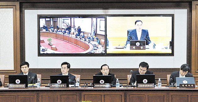 정홍원 국무총리가 28일 오전 서울 세종로 정부서울청사와 정부세종청사에서 열린 원격 화상 국무회의에서 화상을 통해 모두발언을 하고 있다.