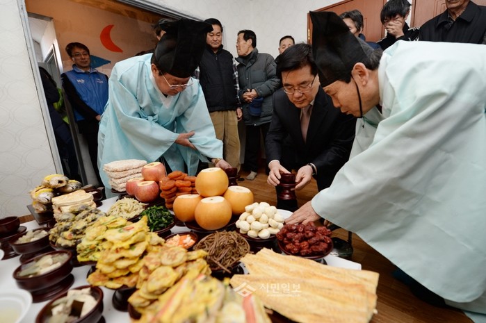 [시민일보]서울 동대문구가 지난 1월29일 지역내 직능단체와 자원봉사자들의 후원으로 고향에 내려가지 못한 저소득층 쪽방촌 주민들과 함께 합동차례를 지내고 음식을 나눠먹으며 설날의 의미를 함께 되새겼다. 사진은 성균관유도회의 도움을 받아 합동차례를 지내는 유덕열 구청장의 모습.