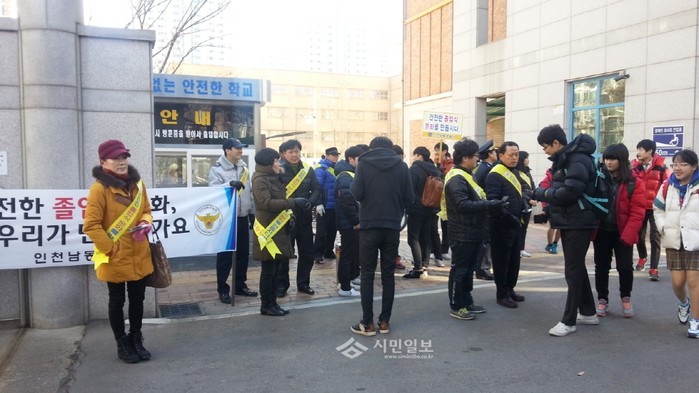 [시민일보]지난 4일 인천 남동구 동방중학교 앞에서 남동경찰서 경찰관, 학부모 보안관 등 60여명이 참석한 가운데 밀가루 투척, 교복 찢기 등을 지양하는 '건전한 졸업식 문화 만들기' 캠페인을 실시했다. 사진은 중학생들을 상대로 홍보물을 배부하며 건전한 졸업식 문화를 알리는 참여자들의 모습.