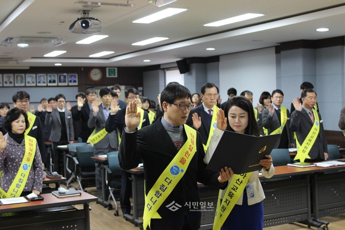 [시민일보]충남 아산교육지원청은 지난 3일 교육비리 근절을 위해 업무전 전직원을 대상으로 교육비리 근절 및 청렴실천을 다짐하는 결의대회를 개최했다. 사진은 공무원 행동강령 이행 등을 실천하기 위한 청렴다짐 선서를 실시하고있는 직원의 모습.