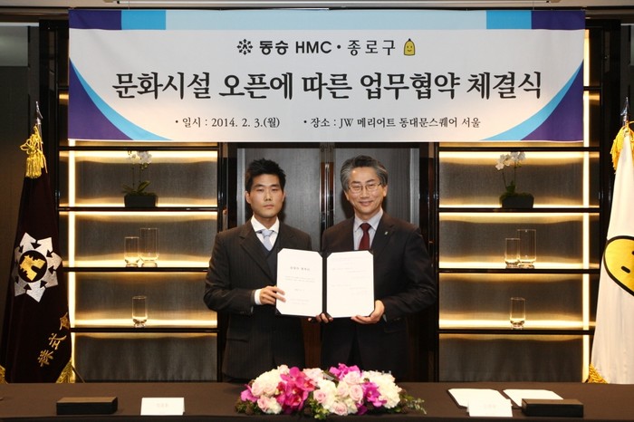 [시민일보]지난 3일 서울 종로구는 JW메리어트 동대문스퀘어 서울과 호텔 지하 1층내 1337㎡ 가량을 지역주민과 국내ㆍ외 관광객에게 전통문화를 소개하는 문화공간으로 조성해 20년간 사용한다는 업무협약 체결식을 열었다. 사진은 김영종 구청장(오른쪽)과 동승 HMC 관계자(왼쪽)의 모습.