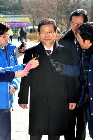 | ▲ 국가정보원 대선 개입 의혹 수사를 축소·은폐한 혐의로 재판에 넘겨진 김용판 전 서울검찰청장이 6일 오전 서울 서초구 서울 중앙지법 앞에서 기자들의 질문을 받고 있다. /뉴시스 | ||