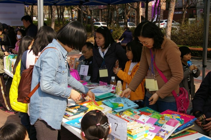 | ▲ 지난해 4월 소월아트홀 광장에서 열린 알뜰도서장터에 참여한 주민들이 책들을 살펴보고 있다. | ||