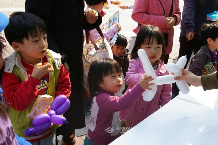| ▲ 알뜰도서장터에 참여한 어린이들이 부대행사로 진행된 풍선공예코너에서 풍선공예품을 받고 있다. | ||