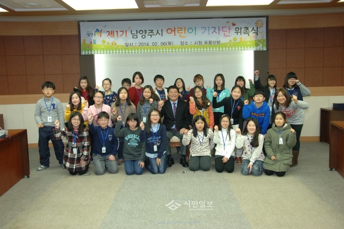 [시민일보]지난 6일 경기 남양주시가 어린이들의 자기개발과 직업체험에 도움을 주고 애향심을 키우고자 지역내 초등학생 39명을 어린이기자단으로 위촉했다. 사진은 이날 열린 위촉식에 참여한 이석우 남양주시장과 어린이기자들이 기념촬영을 하는 모습.