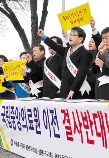 7일 오전 서울 중구 을지로 국립중앙의료원 앞에서 중구, 종로구, 성동구, 동대문구, 성북구 의회 공동주최로 열린 국립중앙의료원 이전 반대 기자회견에서 참가자들이 구호를 외치고 있다. 이날 기자회견을 주최한 5개 자치구의회는 국회가 서울도심권 의료공백에 대한 대책마련 없이 국립중앙의료원 이전경비 예산을 편성해 저소득층과 서민층 주민들의 공공의료 혜택을 박탈했다며, 대책없는 국립중앙의료원 이전계획을 즉각 중단할 것을 촉구했다.